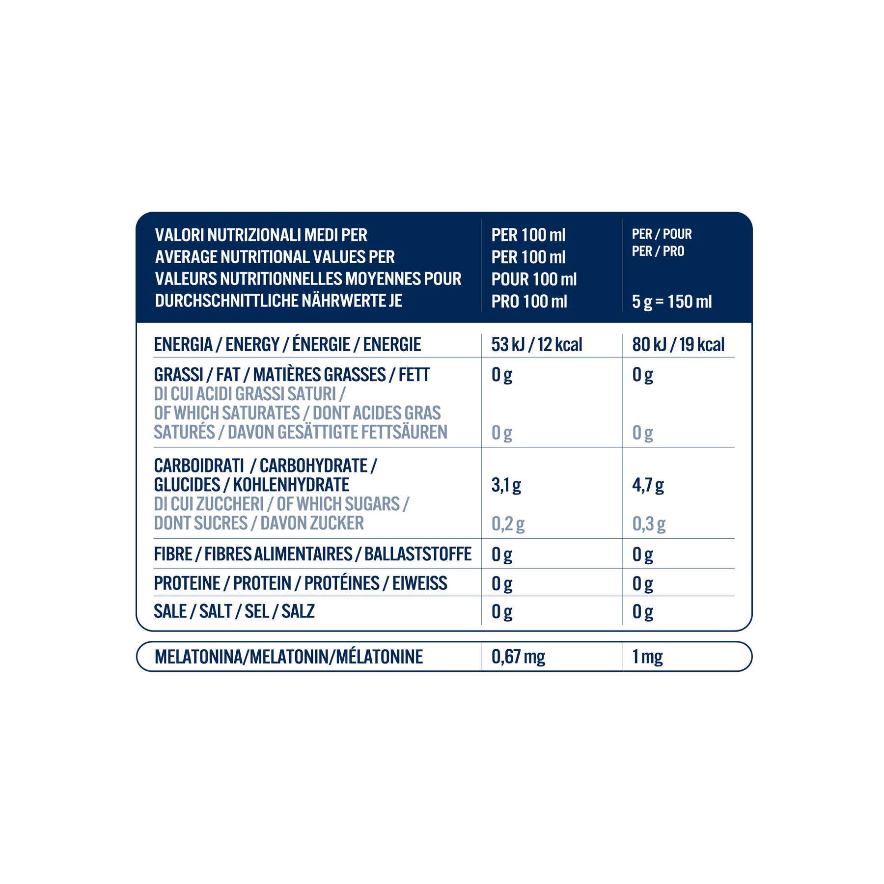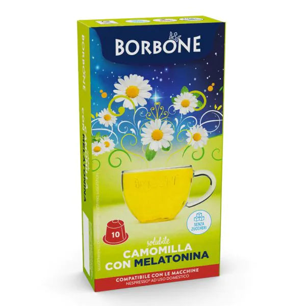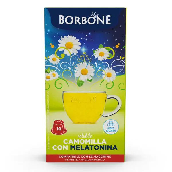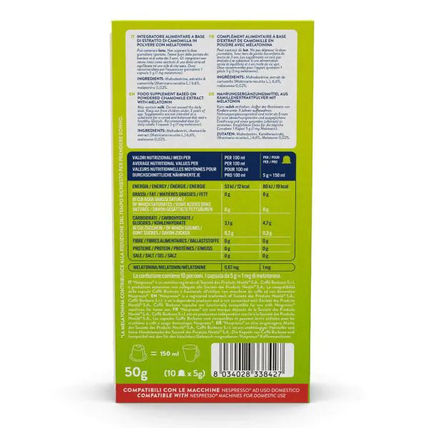 Camomilla solubile con melatonina, senza zuccheri. Compatibile con macchine Nespresso®* ad uso domestico. Confezione composta da 10 pz. Integratore alimentare a base di estratto di Camomilla in Polvere con Melatonina.
