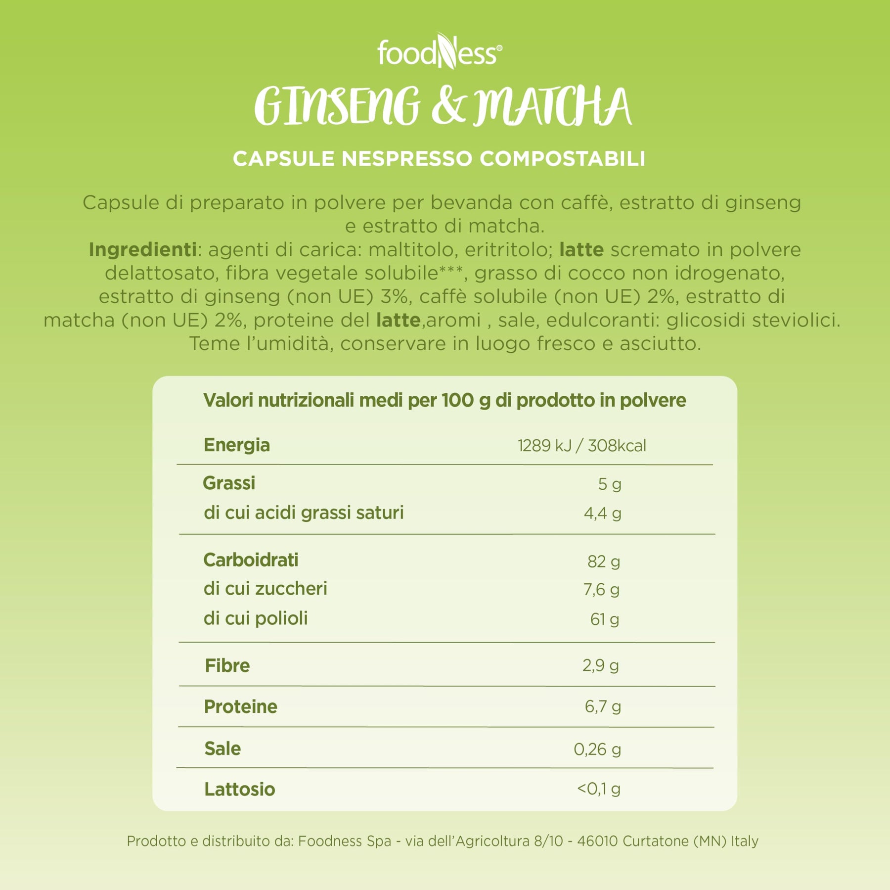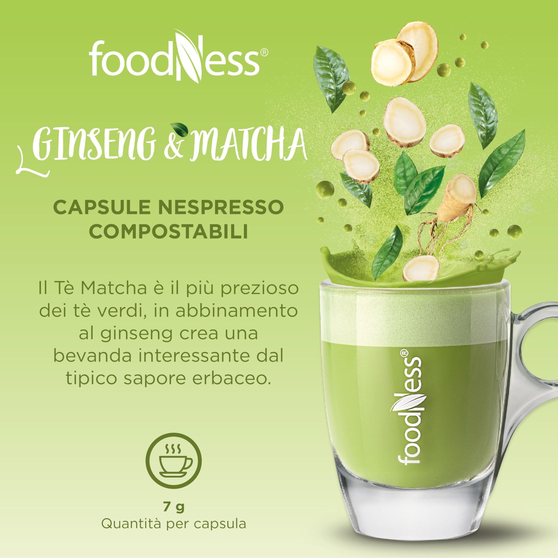 Ritrova vitalità e benessere con le capsule Ginseng e Matcha FoodNess, compatibili con macchine Nespresso. Un mix innovativo che unisce le proprietà energizzanti del ginseng al gusto unico e fresco del matcha, per una bevanda sana e piacevole in ogni momento della giornata.
