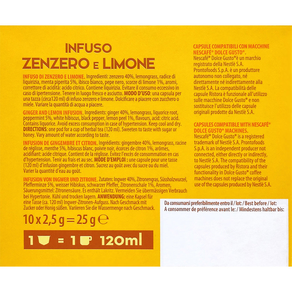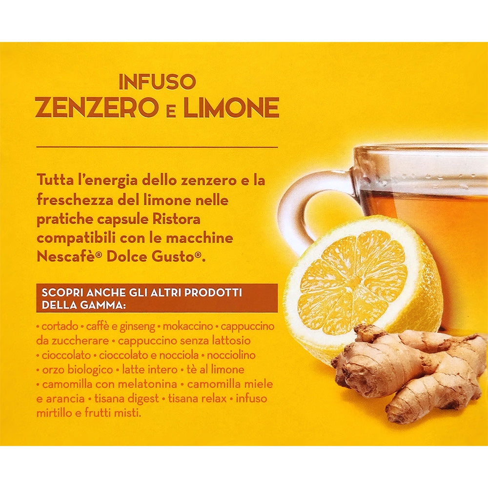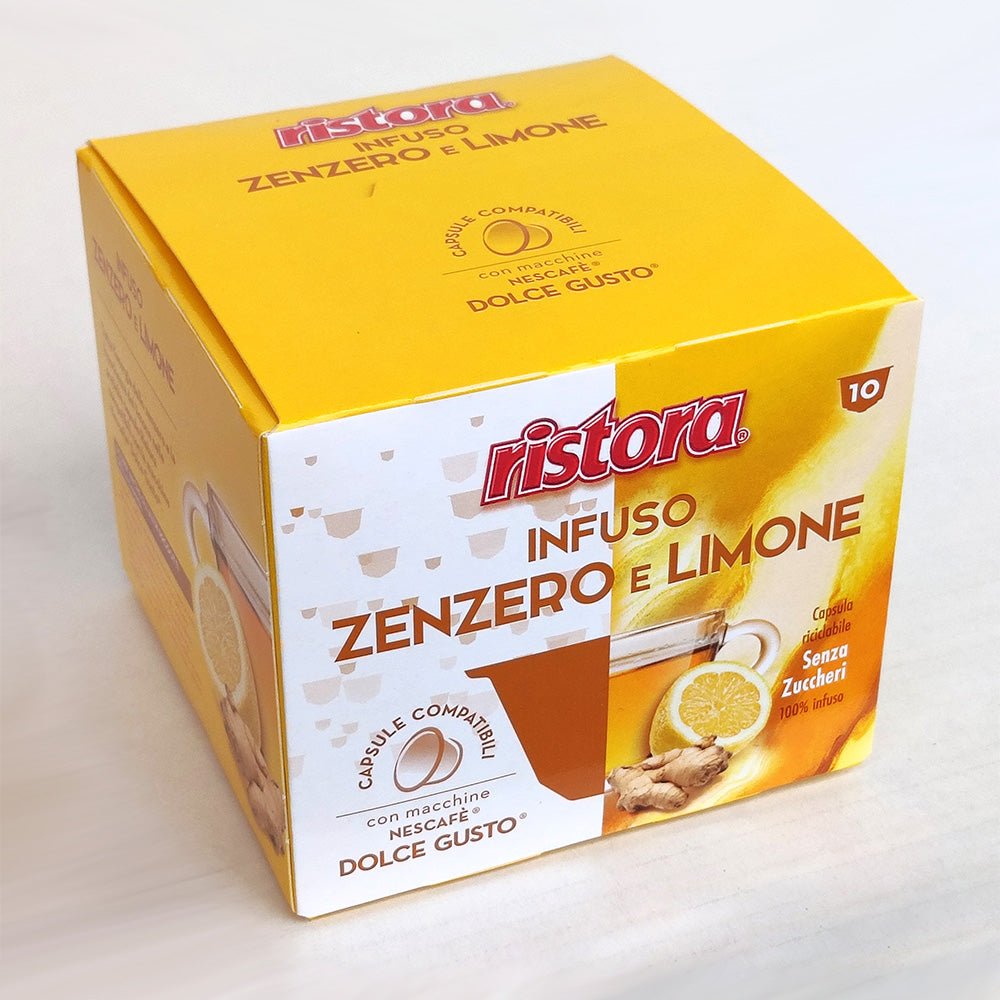 Scopri l'unione perfetta di zenzero e limone con le 10 capsule Ristora compatibili Dolce Gusto. Questa bevanda fresca e dissetante è ideale per chi cerca un momento di benessere e gusto, arricchito da note naturali e vitaminiche.