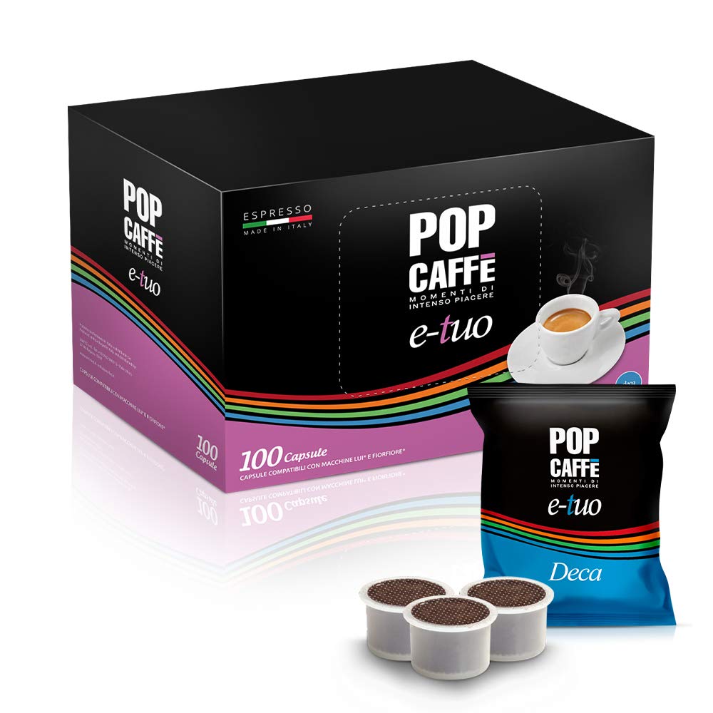 Le 100 Capsule Pop Caffè E-Tuo miscela Decaffeinato sono compatibili con le macchine Lui e Fior Fiore Coop, ideali per chi desidera un caffè dal gusto delicato e senza caffeina, mantenendo tutta la qualità e l’aroma autentico del caffè tradizionale. Perfette per chi vuole godersi una pausa caffè intensa e cremosa in qualsiasi momento della giornata, senza compromettere il relax serale.