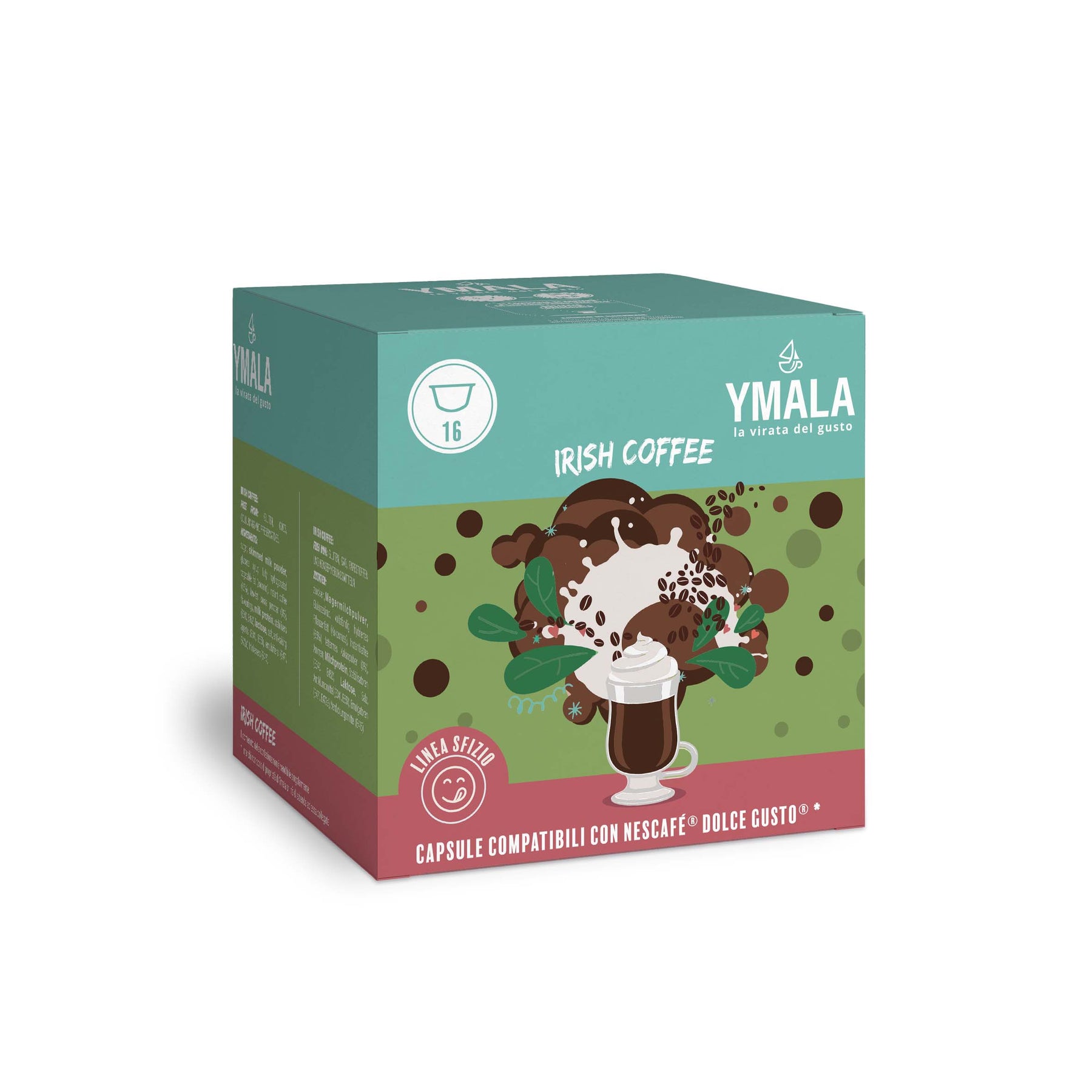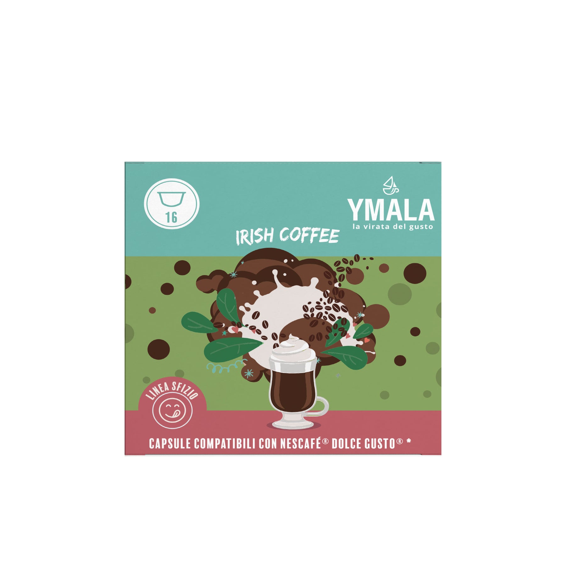 Assapora l'intenso gusto dell'Irish Coffee con le capsule Ymala, compatibili con macchine Dolce Gusto®. Bevanda gustosa con una morbida crema al gusto di irish coffee, offre un sapore ricco e avvolgente, perfetto per chi desidera un'esperienza di caffè unica, ispirata alla tradizione irlandese.