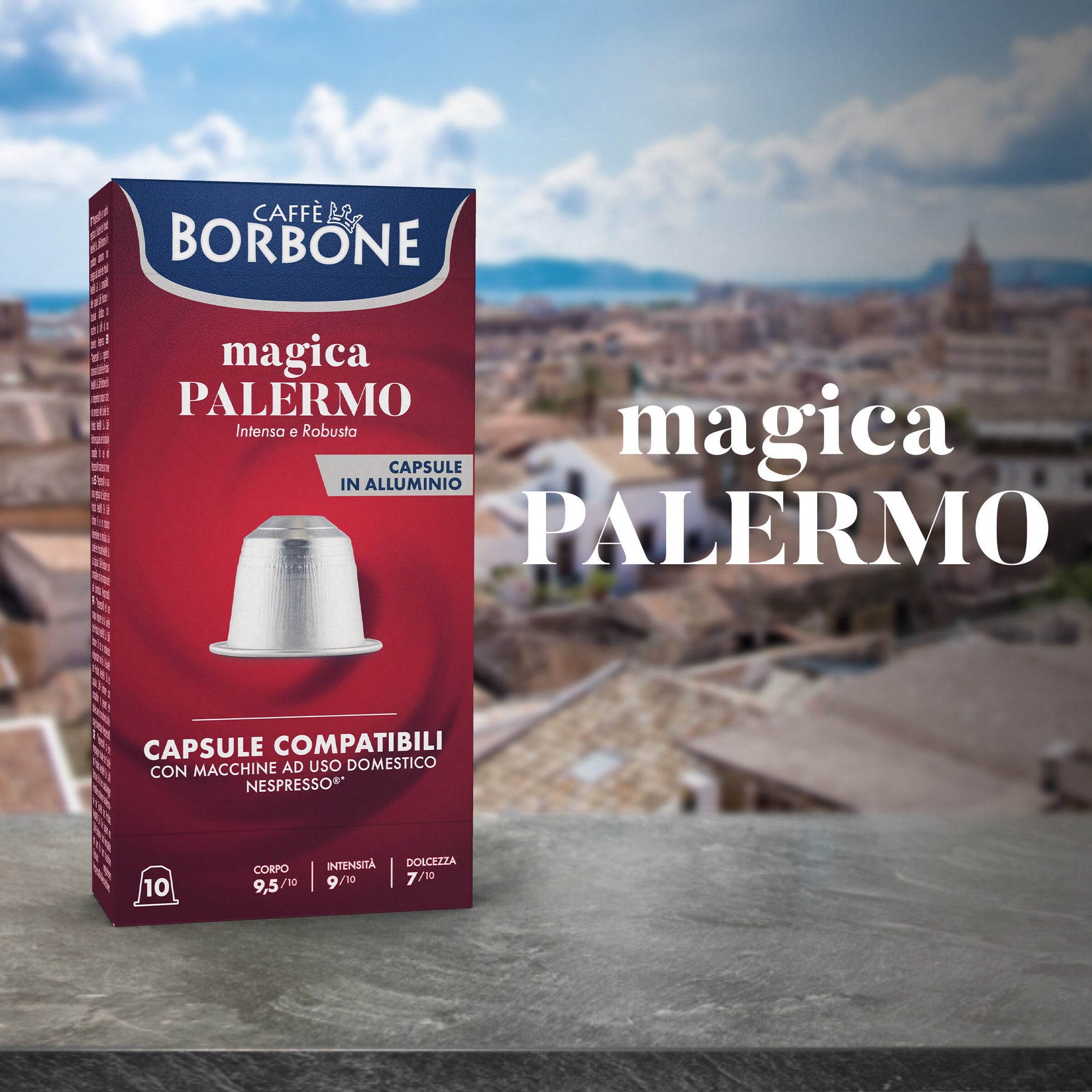Caffè Borbone in capsule in alluminio compatibili Nespresso - Magica PALERMO, crocevia di popoli e culture, è una miscela dal carattere caldo, forte e deciso, con corpo, gusto e persistenza pronunciata. Un viaggio sensoriale, in un sapiente incrocio di raffinati robusta.