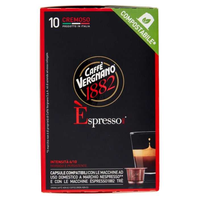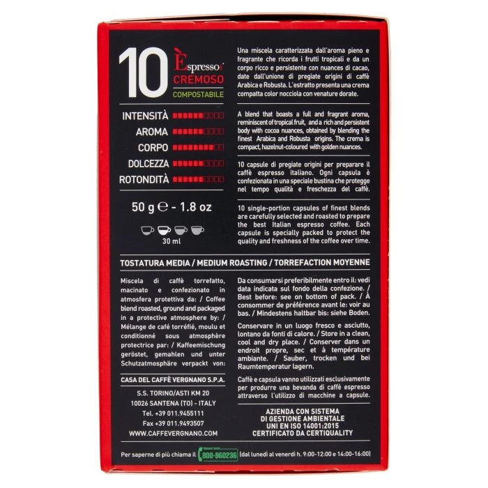 Acquista ora le 10 Capsule Vergnano Cremoso compatibili Nespresso e vivi l’esperienza di un espresso autentico, corposo e cremoso direttamente a casa tua. Non lasciarti sfuggire la qualità Vergnano in ogni tazzina!