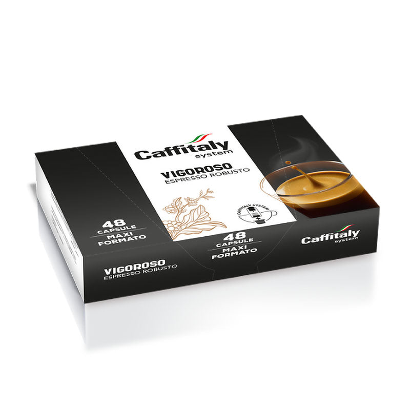 Scopri il gusto intenso di Caffè Vigoroso! Questa confezione da 48 capsule offre un espresso dal carattere forte e deciso, con un'intensità di 10 su 10. Assapora le note di cacao amaro e cioccolato fondente, perfette per un'esperienza di caffè ricca e corposa.