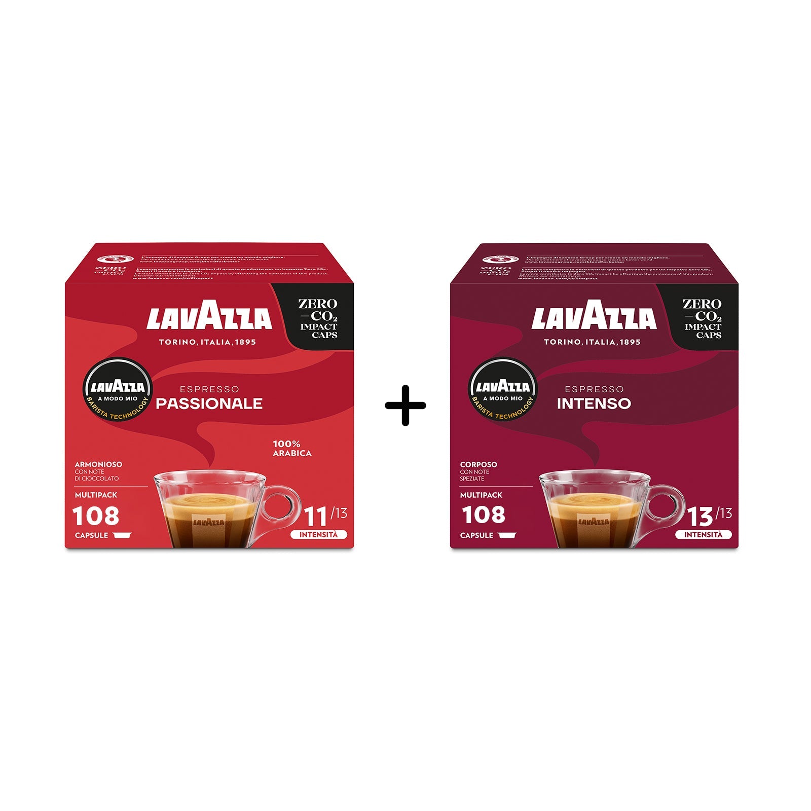 Il set contiene 2 confezioni da 54 capsule di Lavazza A Modo Mio Passionale e 2 confezioni da 54 capsule di Lavazza A Modo Mio Intenso, per un totale di 216 capsule a un prezzo imbattibile. Approfitta subito di questa offerta e scopri il piacere di un caffè dal carattere deciso.
