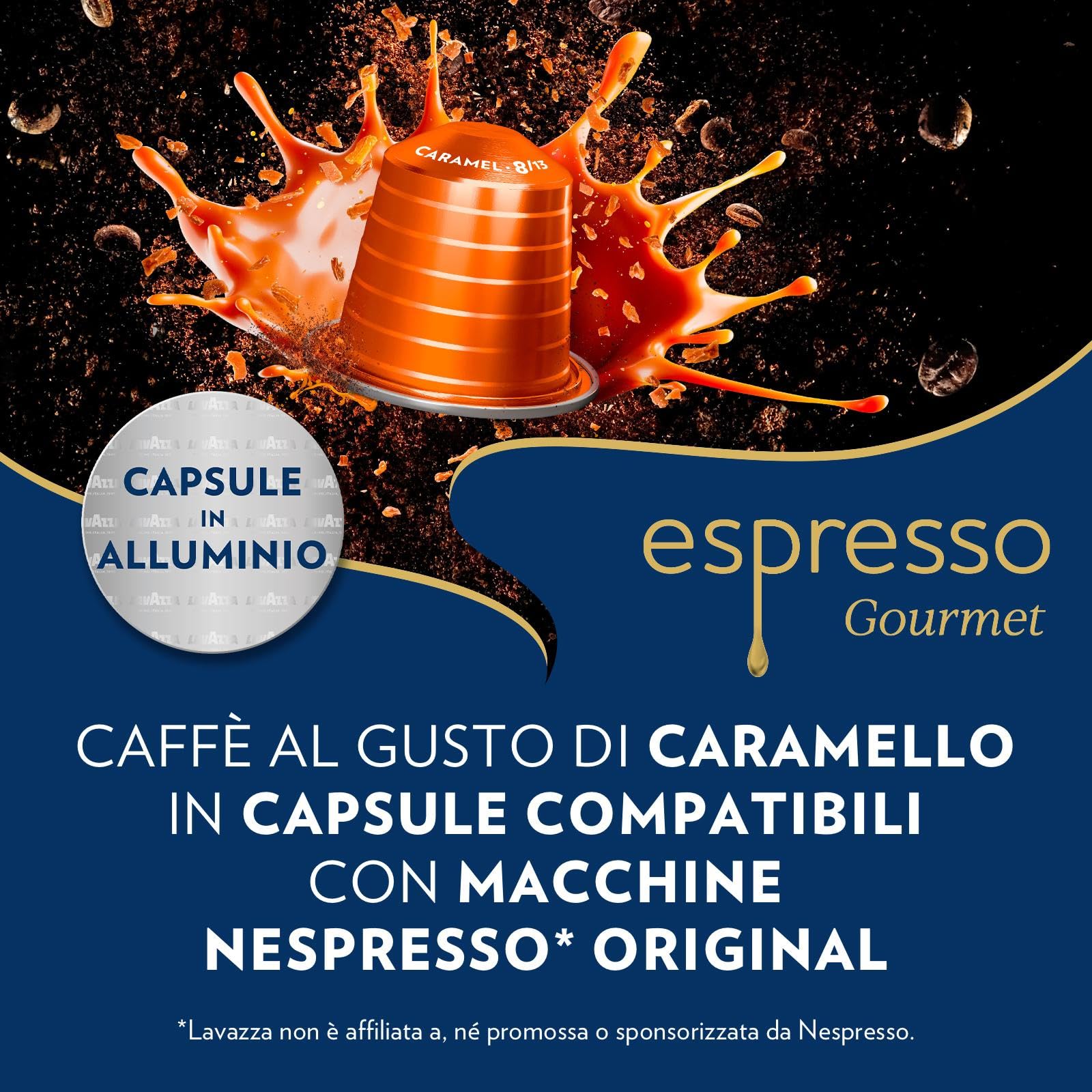 Scopri il gusto raffinato del Lavazza Espresso Gourmet Caramel, capsule compatibili con macchine Nespresso* Original. Una miscela esclusiva di pregiate Arabiche del Centro e Sud America, arricchita con un delizioso aroma naturale di caramello, per un espresso equilibrato, dolce e avvolgente.