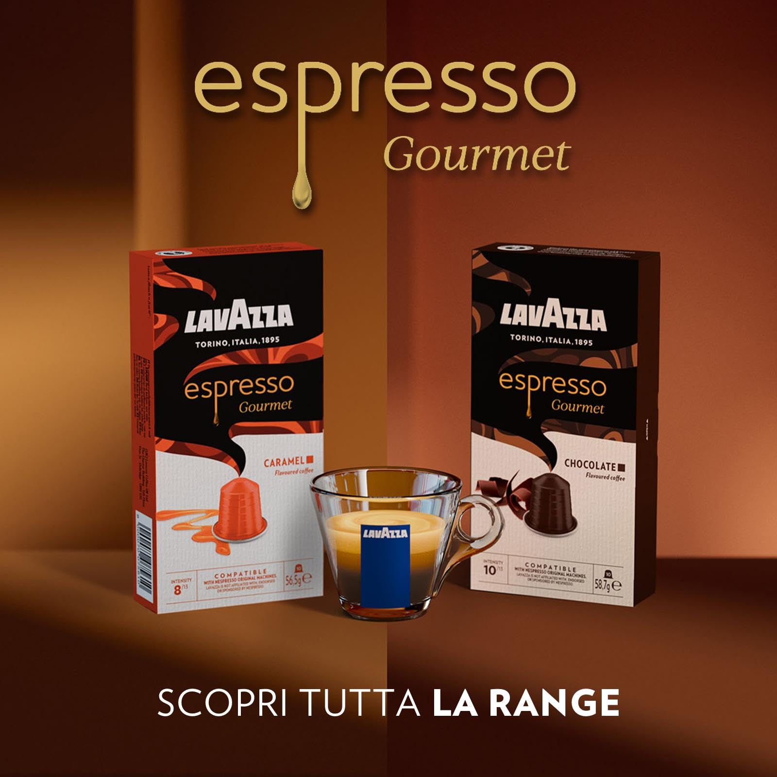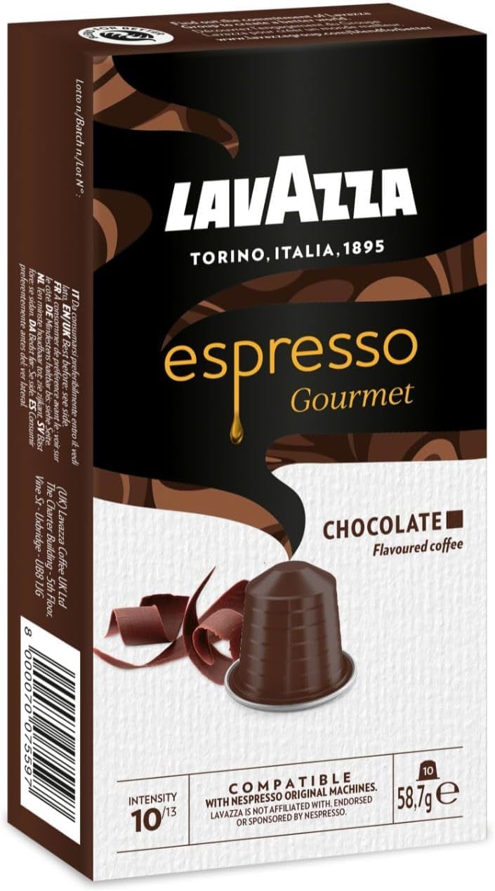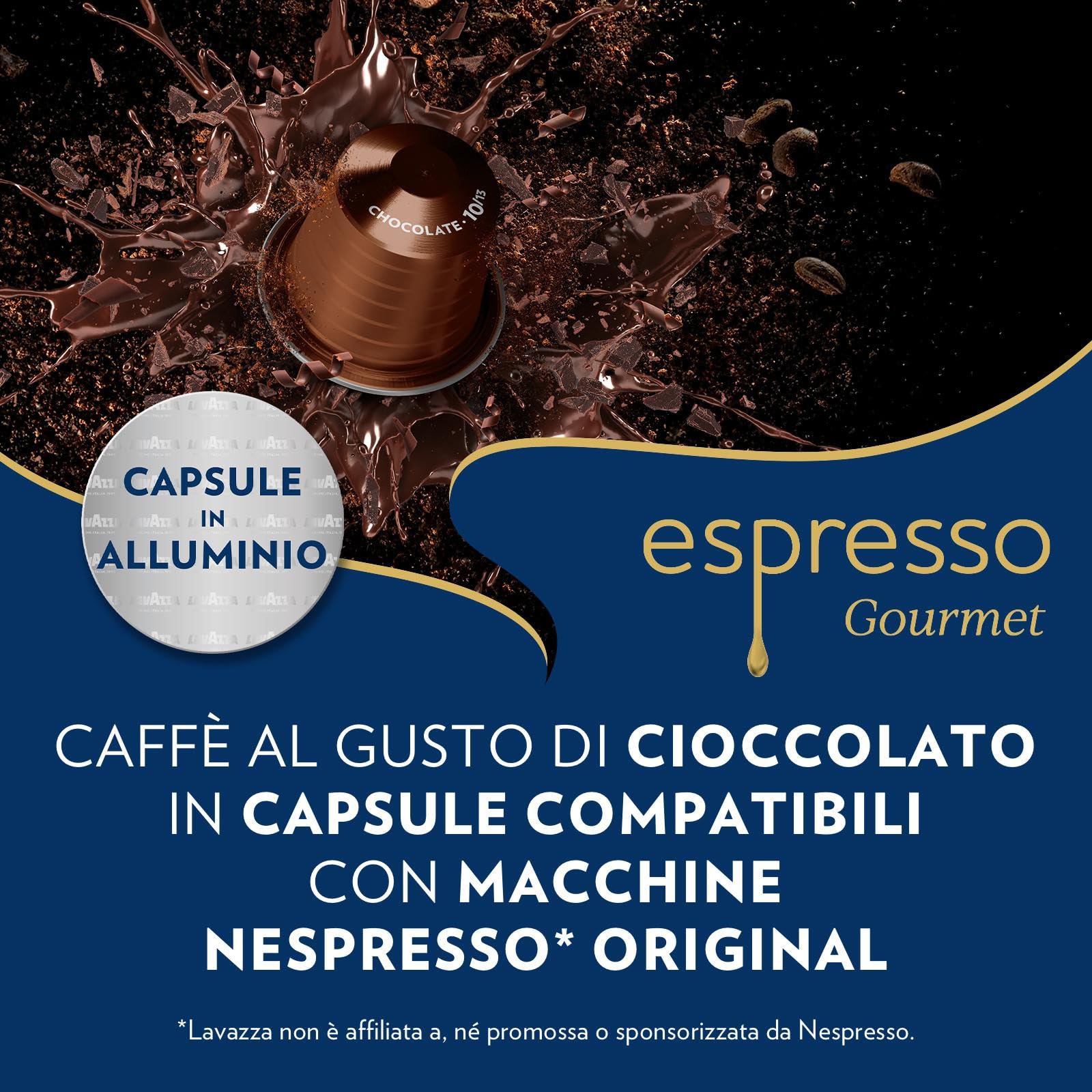Scopri il gusto raffinato del Lavazza Espresso Gourmet Chocolate, capsule compatibili con macchine Nespresso* Original. Una miscela pregiata di Arabica brasiliana e Robusta naturale, irresistibile aroma naturale di cioccolato e delicate note di vaniglia.