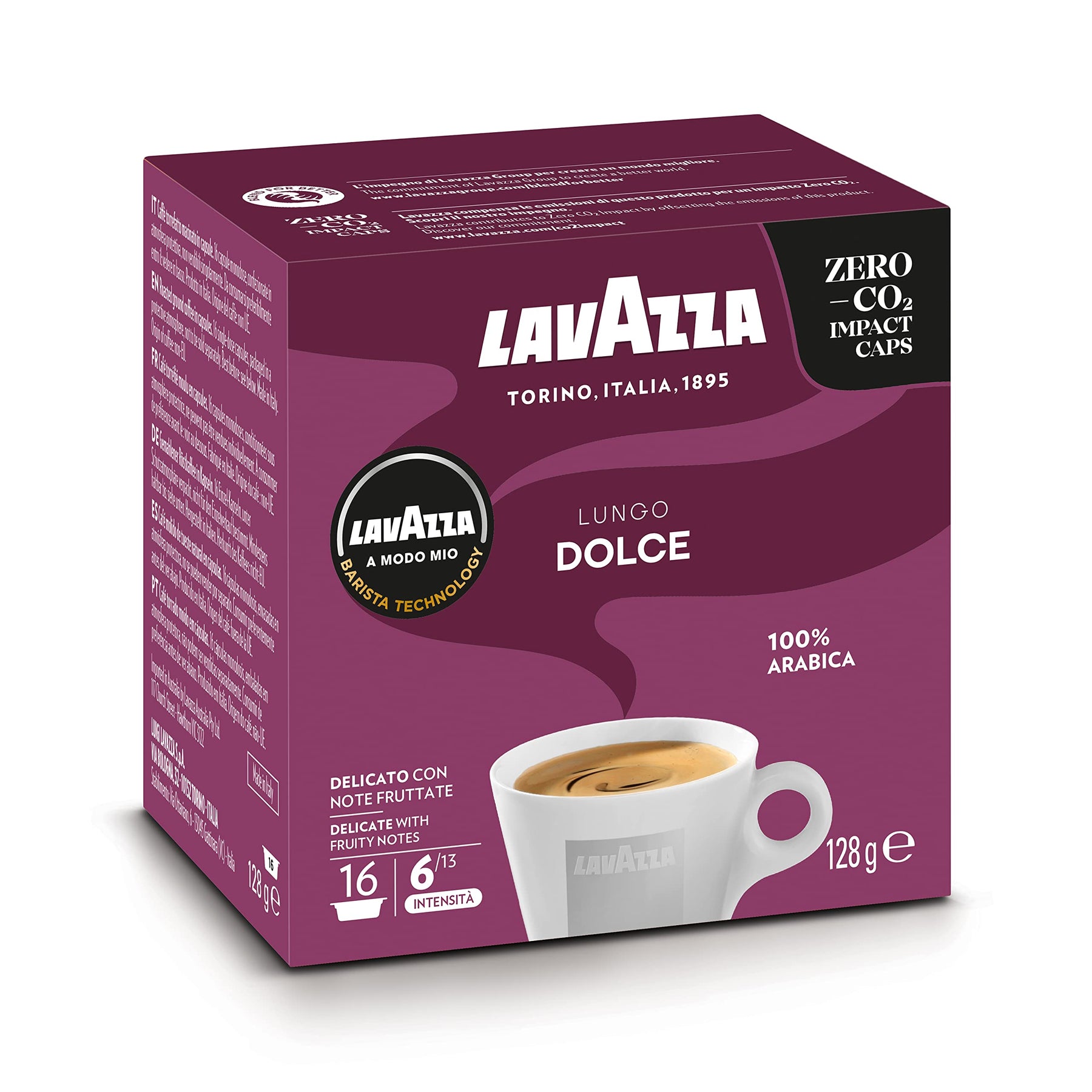 Scopri l'eleganza dell'espresso lungo con le capsule Lavazza A Modo Mio Lungo Dolce, una miscela 100% Arabica proveniente da Sud America e Sud Asia. Questo caffè offre un gusto dolce e morbido, ideale per chi ama un espresso delicato e aromatico.