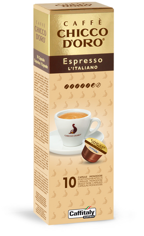Assapora l’autentico espresso italiano con le 10 Capsule Caffè Espresso l'Italiano Chicco d'Oro, compatibili con il sistema Caffitaly. Una sapiente miscela di Arabica e Robusta di eccellente qualità. La tipica tostatura lenta, risalta le proprietà organolettiche ed permette di sviluppare un aroma esotico e corposo.