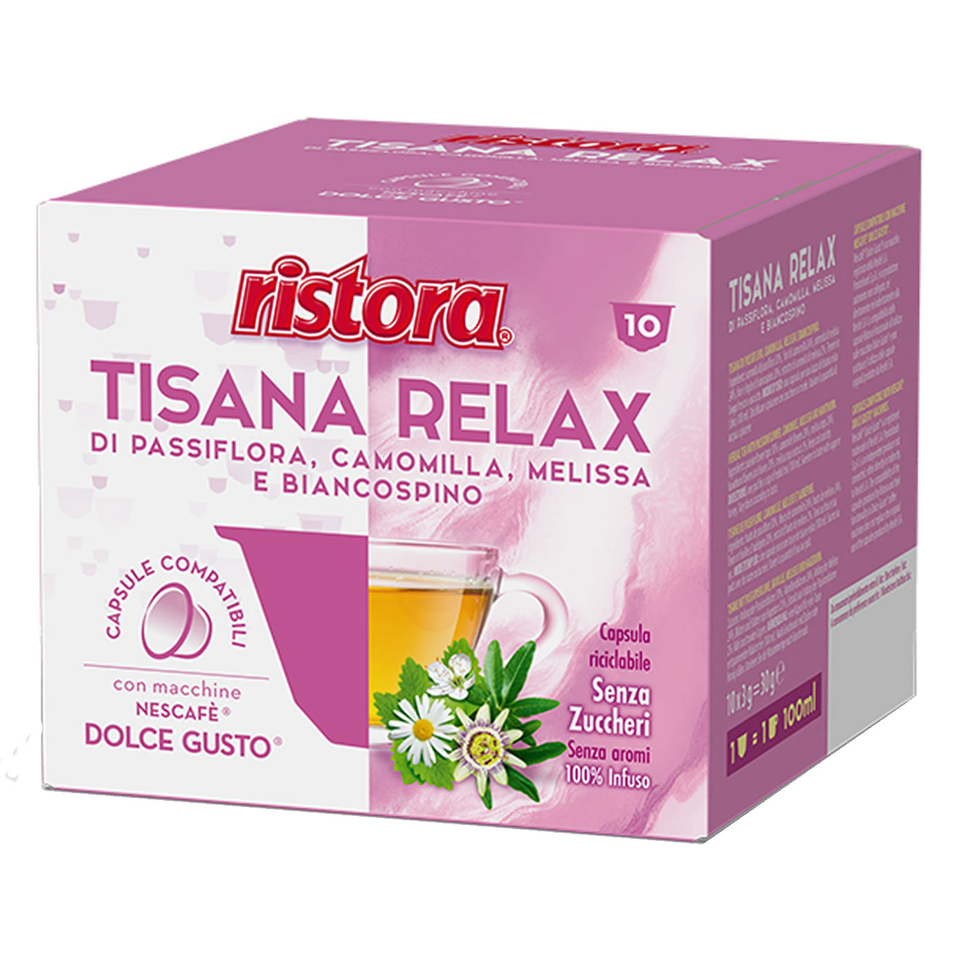 Rilassati con le 10 capsule Tisana Relax Ristora, compatibili con macchine Nescafé Dolce Gusto. Ogni capsula offre un infuso delicato e aromatico, ideale per una pausa tranquilla e rigenerante. Perfette per chi cerca un momento di benessere e relax in modo semplice e veloce.