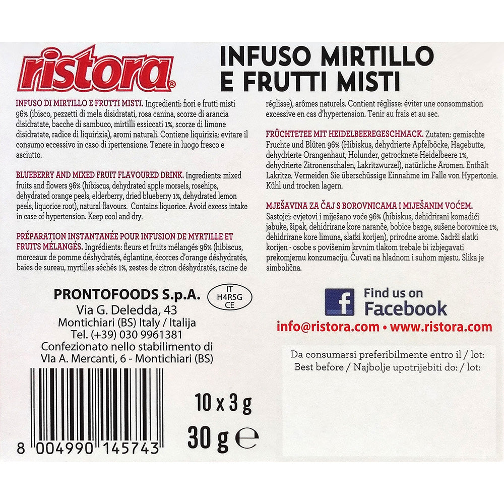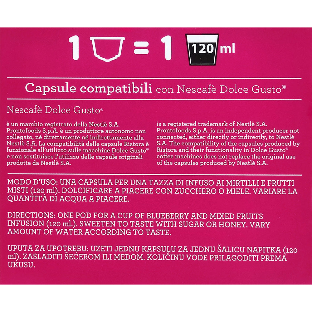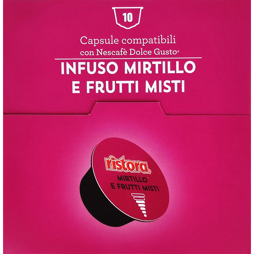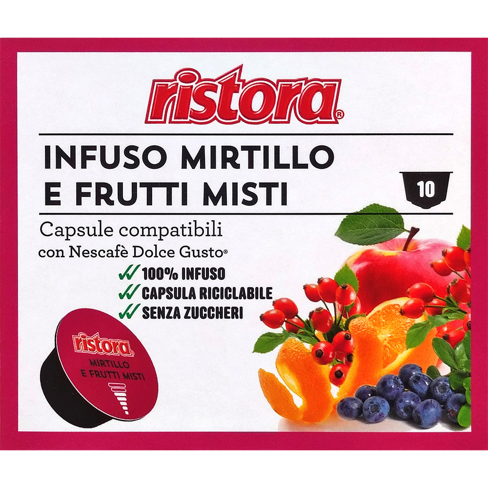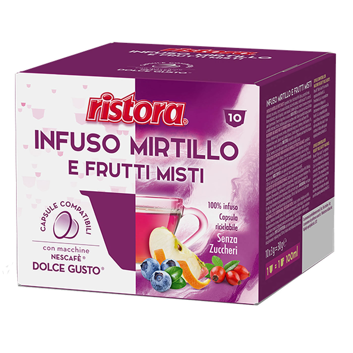Assapora l'intenso e fresco aroma dell'infuso Ristora Mirtillo e Frutti Misti con queste 10 capsule compatibili Nescafé Dolce Gusto. Una bevanda leggera e aromatica, perfetta per chi desidera un momento di relax con un tocco di gusto naturale e fruttato.
