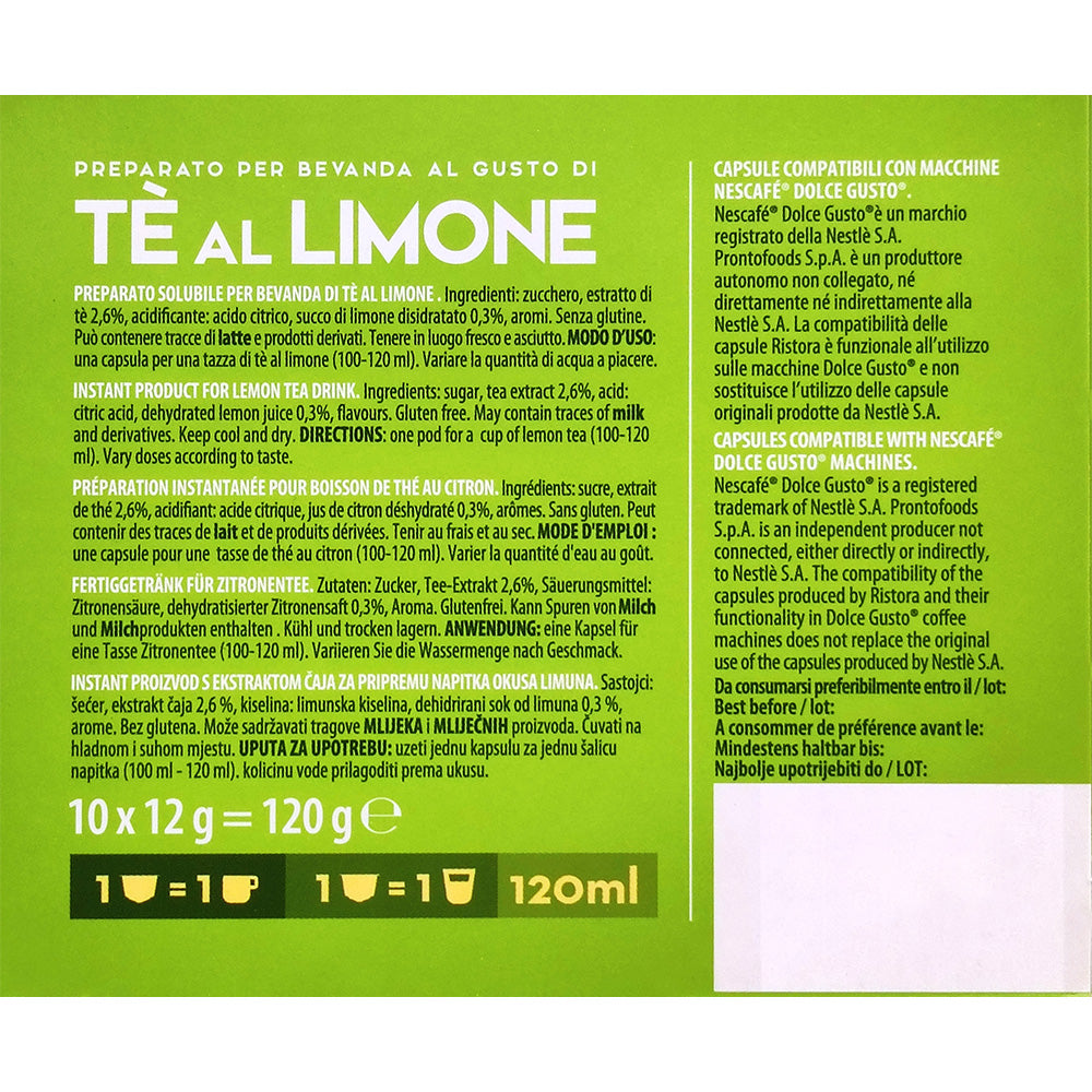 Le 10 capsule Ristora Tè al Limone compatibili con Nescafé Dolce Gusto sono perfette per chi ama un tè dal sapore fresco e agrumato, da preparare facilmente in casa o in ufficio. Questa miscela combina la delicatezza del tè con l’intensa freschezza del limone, offrendo una bevanda dissetante e aromatica, ideale per una pausa rigenerante in ogni momento della giornata.