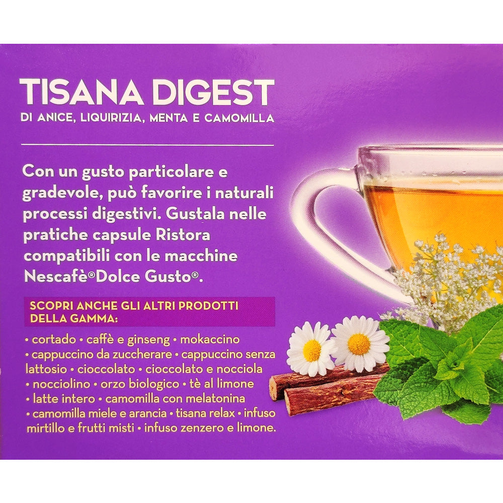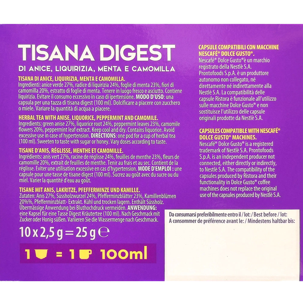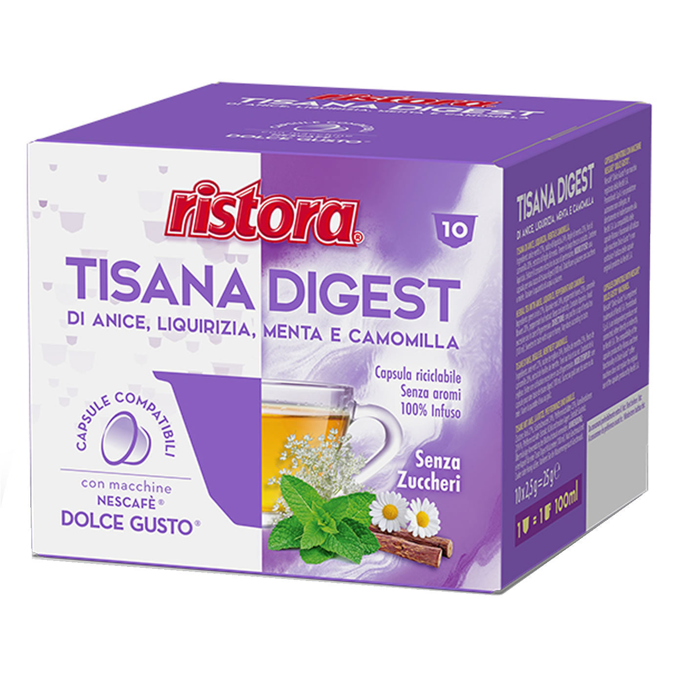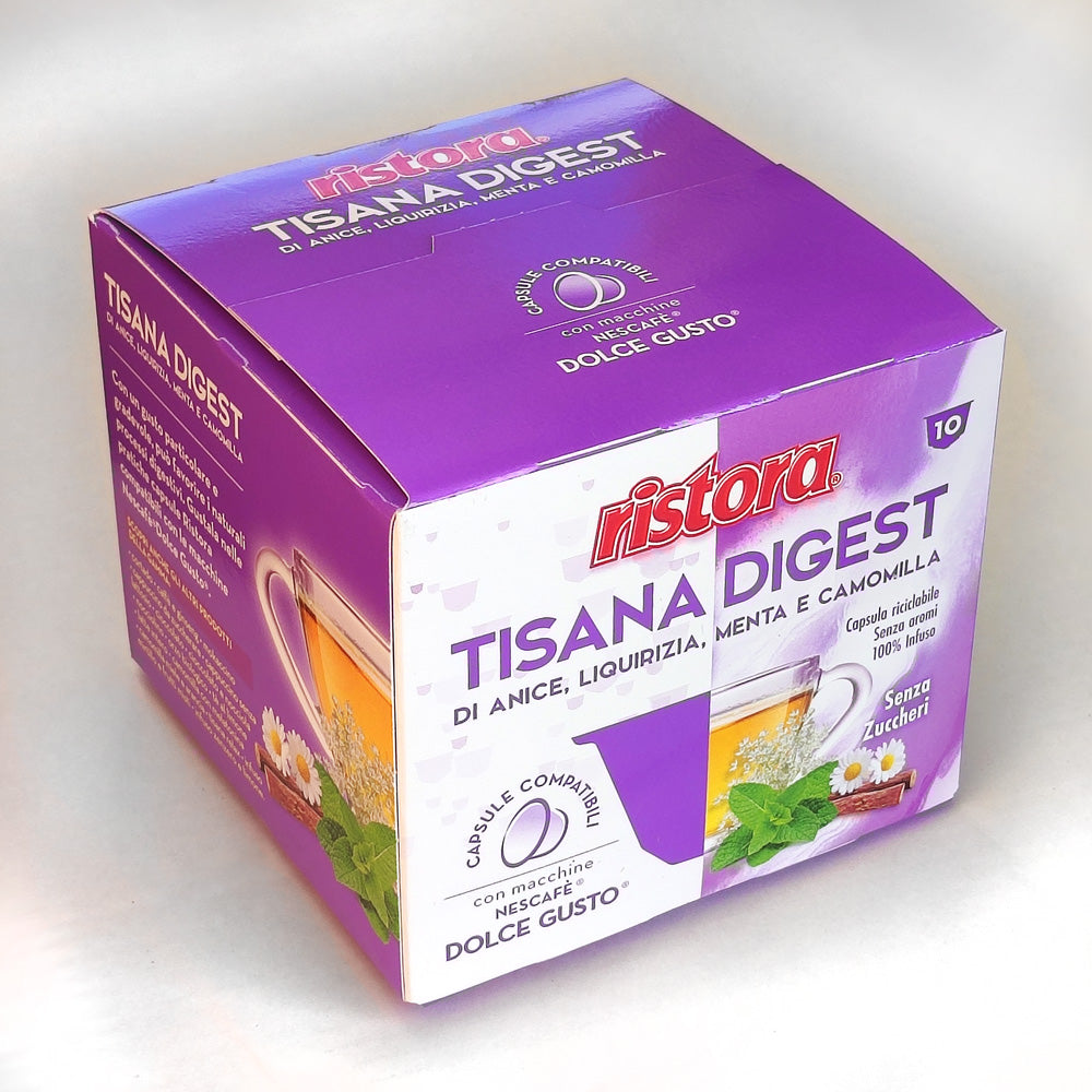 Favorisci la digestione con le 10 capsule Tisana Digest Ristora, compatibili con macchine Nescafé Dolce Gusto. Le 10 capsule Tisana Digest Ristora, offrono un mix selezionato di erbe adatte a favorire la digestione. Ogni capsula contiene un blend naturale che unisce finocchio, coriandolo, liquirizia e anice stellato, ingredienti noti per le loro proprietà benefiche sul sistema digestivo.