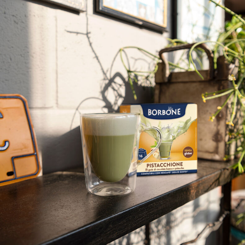 Bevanda al gusto di cioccolata bianca e pistacchio Borbone compatibile con macchine Nescafé Dolce Gusto. Assapora un'esplosione di gusto!