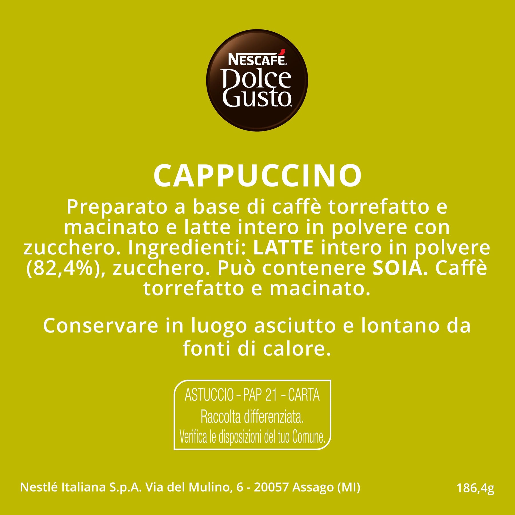 Gusta a casa tua un cappuccino cremoso e aromatico con le capsule Nescafé Dolce Gusto, ideali per chi cerca qualità e praticità. Perfette per la tua macchina Dolce Gusto, ogni capsula contiene la giusta quantità di caffè e latte in polvere per una tazza equilibrata e dal sapore autentico.