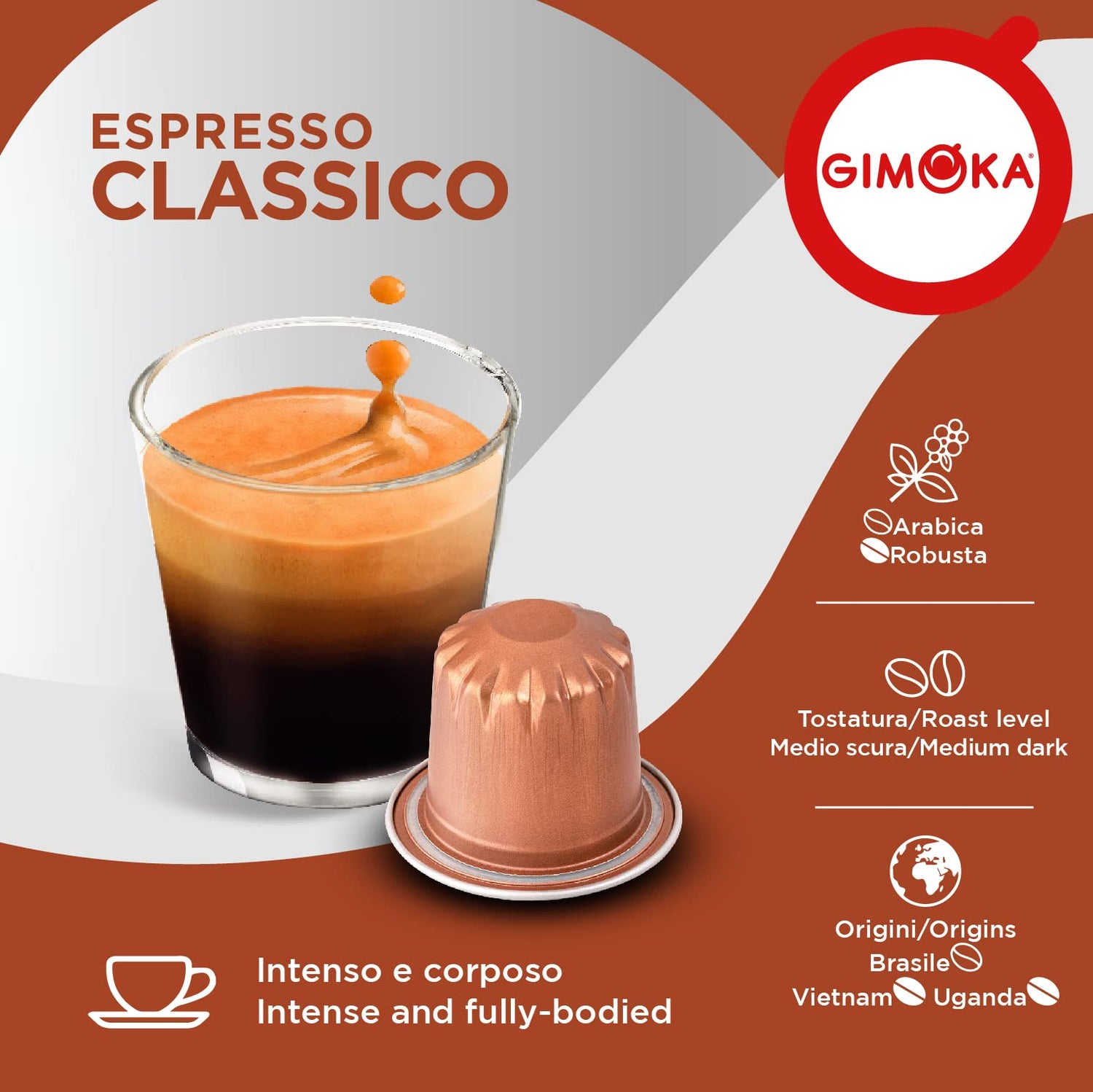 Le 10 Capsule Gimoka Compatibili Nespresso Classico in alluminio offrono un espresso dal gusto equilibrato e avvolgente, perfetto per chi ama una pausa caffè di qualità superiore. La miscela selezionata garantisce un aroma intenso e una crema compatta, esaltando ogni tazzina con un sapore autentico e persistente. Il packaging in alluminio mantiene freschezza e aromaticità più a lungo, assicurando una preparazione sempre impeccabile con le macchine Nespresso.