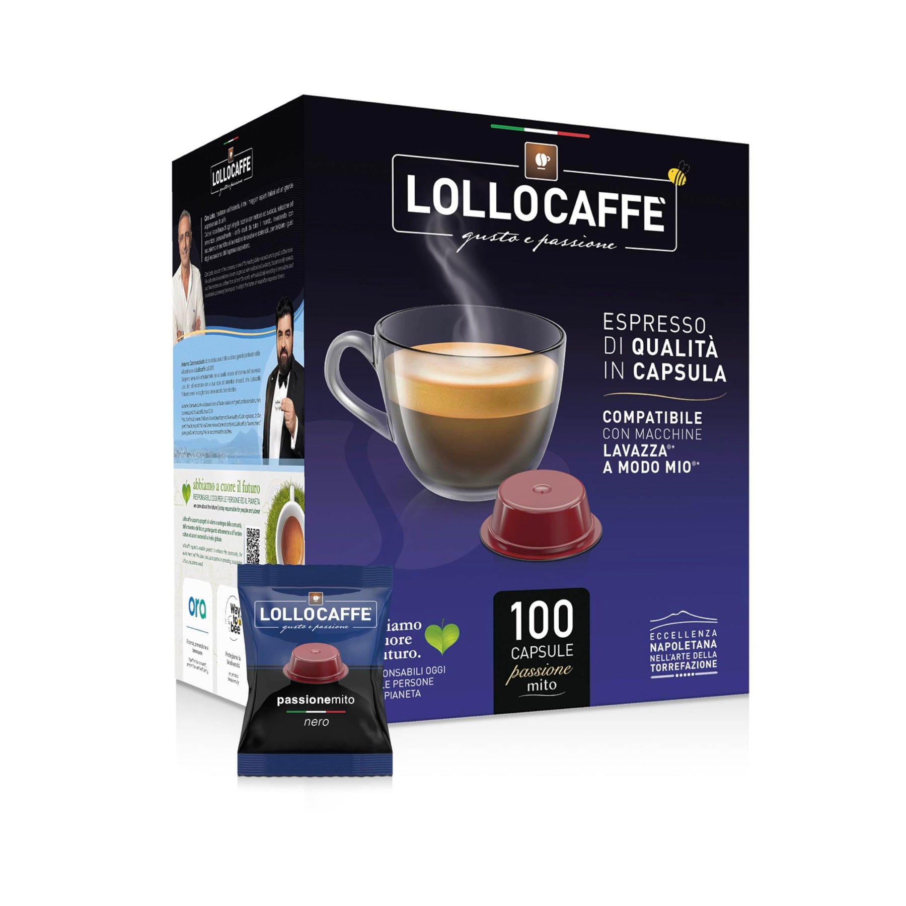 Riscopri l’intensità del vero espresso napoletano con le 100 capsule Lollo Caffè Nero, compatibili con sistemi Lavazza® Espresso Point®*. La miscela Nero è pensata per chi ama un caffè dalla forte personalità, con crema spessa e gusto pieno.