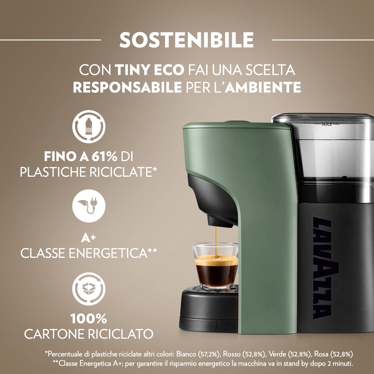 Lavazza A Modo Mio Tiny Eco, la prima macchina Lavazza A Modo Mio realizzata con plastica riciclata. Fai una scelta responsabile per l'ambiente, acquista la nuova Tiny Eco.