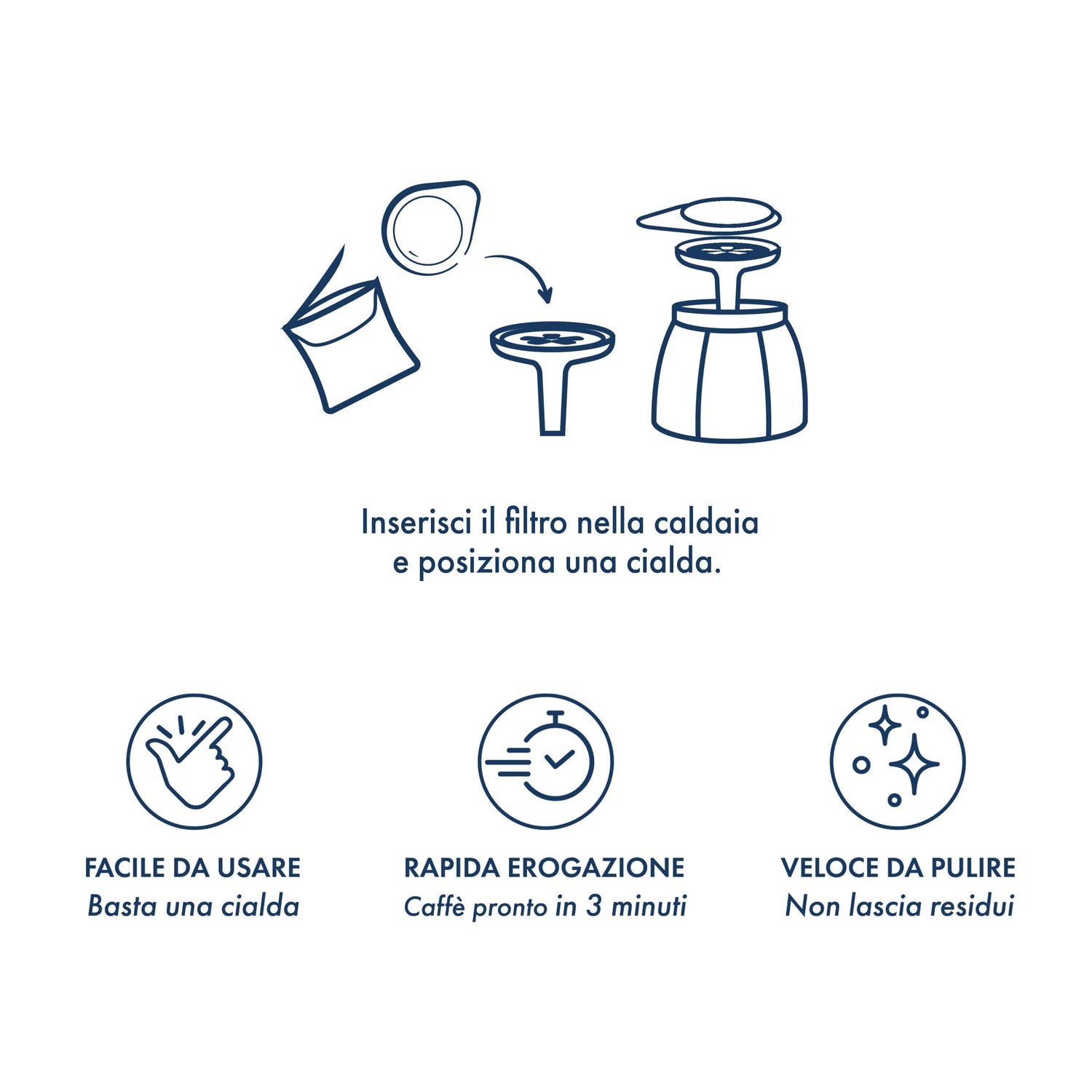 In esclusiva per te: acquistando questa moka riceverai subito 15 cialde Miscela Blu in OMAGGIO, per gustare immediatamente l'aroma unico ed equilibrato del vero caffè napoletano.